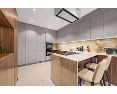 Die Küche schließt harmonisch an den Wohnraum an. Ausgestattet mit hochwertiger Einbauküche, Gas-Kochfeld, Siemens-Geräten, Liebherr-Kühlschrank und Berbel-Dunstabzugshaube bietet sie zudem eine elegante Bar mit zwei Hockern und direkten Balkonzugang.