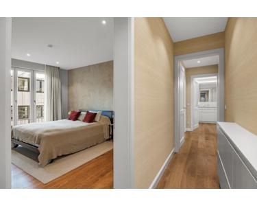 Maßgefertigte Einbauschränke im Flur führen in den privaten Bereich. Das Hauptschlafzimmer im Westflügel verfügt über Balkonzugang und ein Bad en suite mit Regenschauer-Dusche, Wanne, abgetrenntem WC, Einbauschränken und integriertem Audiosystem.