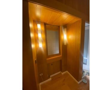 -der Flur ist mit maßangefertigten und holzvertäfelten Einbauschränken im Stil der 60er Jahre ausgestattet