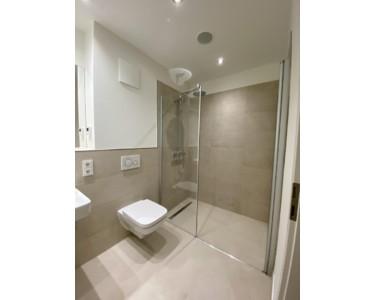 - Modern bathroom with large, level-access shower
