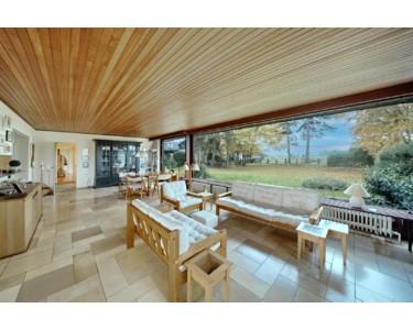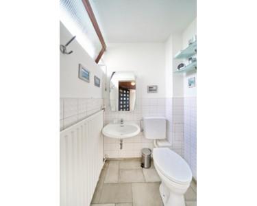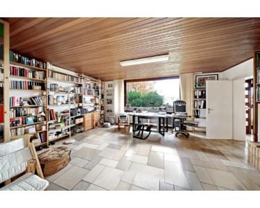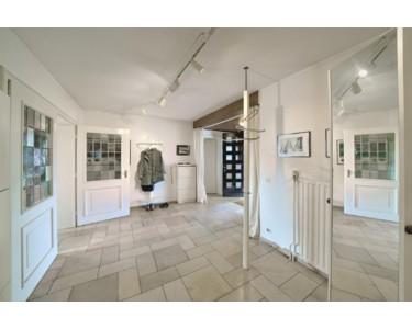 Kaminofen, hochwertige Sollnhofer Platten in Wohnzimer, Flur und Arbeitszimmer, Parkett in Schlafzimmern