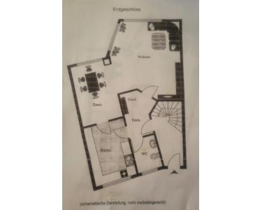 Im Erdgeschoss bildet das helle über 50 qm große Wohn-/Esszimmer mit dem gemauerten Kamin und dem Zugang zum Garten das Zentrum des Hauses. Die große, separate Küche bietet auch noch Platz für eine gemütliche Sitzecke. Außerdem befinden sich hier ein großzügiges Gäste-WC sowie eine vom Treppenhaus getrennte Diele.