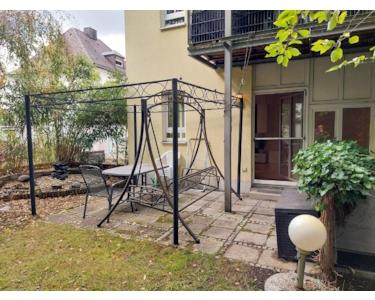 Traumhafter 120 m² Privatgarten mit Teich, Hollywoodschaukel, Tisch und Gartenstühle, Gartengeräte und Gartenhaus