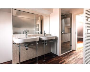 Die Wohnung verfügt über zwei voll ausgestattete Bäder. Im oberen Masterbereich befindet sich ein luxuriöses Bad mit großer Eckbadwanne sowie einer separaten Dusche.
