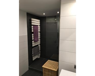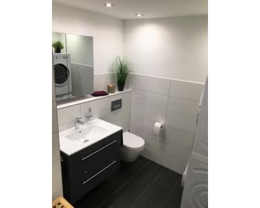 Das innenliegende Badezimmer wurde 2015 umfassend modernisiert und mit einer begehbaren Dusche und einer integrierten Lüftung ausgestattet. Im Bad befindet sich zudem eine Stellmöglichkeit für eine Waschmaschine und einen Trockner. Ein separater, geräumiger Trockenraum steht im Untergeschoss direkt unter der Wohnung zur Verfügung.