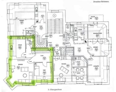 In bester Lage in Dresden Striesen verkaufen wir von privat unsere sehr schön geschnittene 5 - Zimmerwohnung. Es handelt ich um eine Eckmaisonette mit Turmzimmer, zwei Bädern, Dachterrase, einem großen Dachoberlicht und einer Wohnfläche von ca. 135 m². Das Gebäude aus dem Jahr 1910 wurde im Jahr 2002 umfangreich saniert. Die Wohnung besitzt Fenster zu drei Seiten und ist sehr hell und einladend. Besonders reizvoll und einmalig in der Wohnung ist das Turmzimmer im DG mit dem freigelegten und aufgearbeitetem Holztragwerk und der kleinen Empore. Sowohl die große Küche als auch das größere Bad sind natürlich belichtet. Die Grundrisse verfügen über eine sehr gute Aufteilung, die Räume sind optimal proportioniert und sehr gut möblierbar. Privatheit garantiert die nach Süden ausgerichtete und nicht einsehbare Dachterrasse. Zu der Wohnung gehört einer von zwei Hofstellplätzen sowie ein eigenes Kellerabteil. Im Erdgeschoss befinden sich ein Bäcker und ein Fahrradladen. Der Garten kann mitgenutzt werden. Das Haus ist sehr gut verwaltet und in einem gepflegten Zustand. Die Eigentümergemeinschaft sorgt für einen guten Erhaltungszustand des Objektes, es existiert ein solides Rücklagenkonto. Die Wohnung ist derzeit vermietet. Mit Erwerb kann ein Sonderkündigungsrecht geltend gemacht werden.