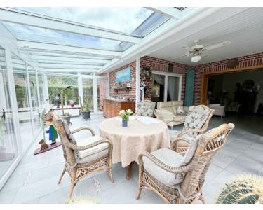 Der Wintergarten mit elektrischer Beschattung ist ein Highlight dieses Anwesens und lädt dazu ein, die Sonne in jeder Jahreszeit zu genießen. Die großzügige Terrasse mit elektrischer Markise erweitert Ihren Wohnraum nach draußen und schafft eine perfekte Umgebung für gesellige Zusammenkünfte oder entspannte Abende im Freien.
