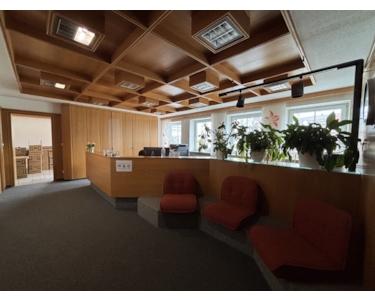 Beim Betreten des Büros gelangen Sie in einen großzügigen Empfangsbereich, der mit Teppichboden ausgestattet ist und eine einladende Atmosphäre schafft. Die großen Fenster sorgen für viel Tageslicht und bieten einen angenehmen Ausblick.