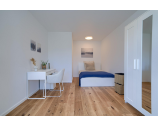 Dich erwartet ein bequemes Bett mit Bettkasten und Zubehör, ein Schreibtisch mit Stuhl für dein Studium oder Home-Office sowie ein großer Kleiderschrank inklusive Aufbewahrungsboxen.
