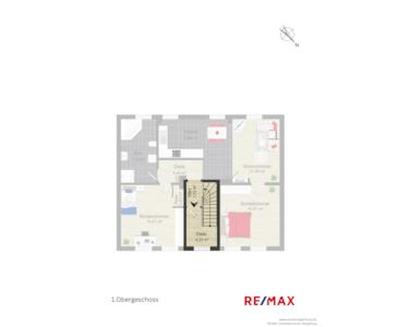 Im 1. Obergeschoss betreten Sie zunächst einen Flur, von dem die Treppe ins Dachgeschoss führt. Dort öffnen sich alle Wohnräume und geben der Wohnung ihren Charakter. Der zentrale Wohn- und Essbereich bietet viel Platz für den Alltag und wird durch den Kamin zu einem besonders gemütlichen Mittelpunkt. Die offene Küche ist mit einer Einbauküche ausgestattet und fügt sich harmonisch in den Raum.