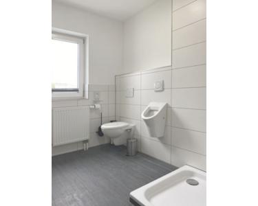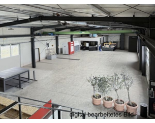 Die Halle mit Betonboden ist sowohl über ein elektrisches ca. 4 x 5 m großes Rolltor und nebenliegender Türe sowie vom Bürobereich im Erdgeschoss zu erreichen. Die Beheizung erfolgt über eine Gas-Dunkelstrahlerheizung. Die Glaselemente im Sektionaltor, viele Fenster sowie ein Oberlicht sorgen für viel Tageslicht. Mehrere Leuchten sind zusätzlich vorhanden. Auf einer Höhe von ca. 4 m befindet sich der Kran mit einer Traglast von 3,2 t. Die Traufhöhe beträgt ca. 5 m. Das abgetrennte Meisterbüro verfügt über ein großes Fenster zur Halle hin und einen Zugang zum nebenliegenden Büro. Gegenüber befinden sich die Umkleide mit Zugang zum gefliesten Waschraum mit drei Duschen, WCs und Waschbecken sowie der Technikraum mit Staufläche. Über dem Meisterbüro ist über eine Stahltreppe eine Mezzaninefläche mit einem Bürocontainer und Kleinlagerfläche vorhanden. Das von der Halle abgetrennte Lager ist offen gestaltet.