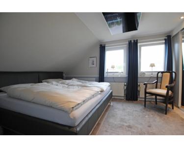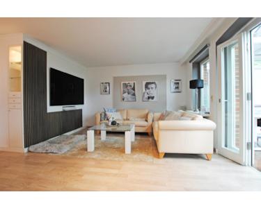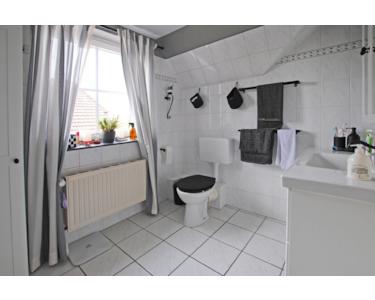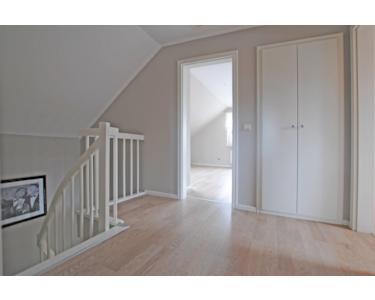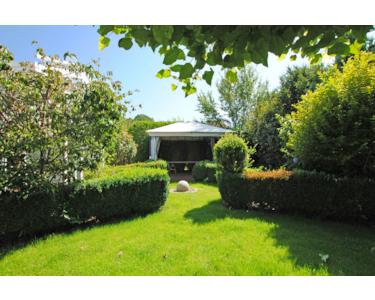 Eine überdachte Terrasse mit Glasdach (2022) sowie eine Terrasse mit Zelt-Pavillon bietet weitere lauschige Fleckchen. Über eine kürzlich lackierte weiße Holztreppe wird das Obergeschoss (ca. 46m²) erreicht; mit ursprünglich geplanten 3 bzw. 2,5 Zimmern und einem hellen Vollbad. Die beiden Kinderzimmer (10m² und 9m²) wurden zusammengelegt; die Trennwand ist entfernt worden und somit profitiert der Raum derzeit von sehr viel Licht und Platz. Ohne großen Aufwand könnte das Zimmer wieder aufgeteilt werden. Die Fenster sind mit elektrischen Beschattungs-Rolläden versehen. Das Elternschlafzimmer ist mit raffiniert eingebauten, begehbaren Kleiderschränken ausgestattet.