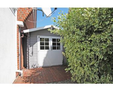 Der Doppelcarport liegt benachbart zum rückwärtigen Schuppen für Gartengeräte und Fahrräder. Ein weiteres Gartenhäuschen bietet zusätzlichen Stauraum.