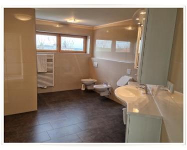 Großes 'Wohlfühlbad' im 1.OG, mit bodengleicher Dusche, Waschbecken, WC, Urinal und Bidet, sowie Fenster; es besteht die Möglichkeit, eine Badewanne einzubauen;