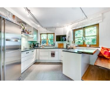 Schon beim Betreten des Hauses gelangen Sie in den Windfang. Die Küche ist mit einer modernen Einbauküche ausgestattet, die über hochwertige Gaggenau und Miele-Geräte verfügt und sofortigen Kochkomfort ermöglicht. Der großzügige Wohn- und Essbereich öffnet sich zum sonnigen Garten. Ein besonderes Highlight ist der idyllische Gartenteich mit Karpfen und beruhigendem Wassergeplätscher – Ihre ganz persönliche Ruheoase.