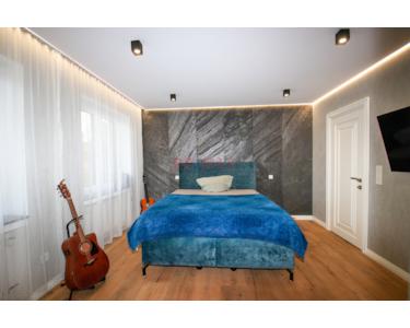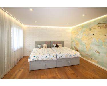 OBERGESCHOSS: Hier befinden sich die Schlafzimmer, an der Zahl 5 Stück. Sie finden hier für jeden die richtige Größe. Im großen Elternschlafzimmer haben Sie Zugang zu einem begehbaren Kleiderschrank und einem Balkon, von dem aus Sie den unverbauten Weitblick über den Taunus genießen können.