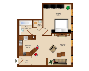 Die Wohnung überzeugt durch ihre durchdachte Raumaufteilung und die hochwertige Ausstattung. Das Wohnzimmer und das Schlafzimmer bieten ausreichend Platz für gemütliches Wohnen und Entspannen. Die Küche ist funktional gestaltet und lässt Raum für individuelle Gestaltungsideen. Die Wohnung verfügt außerdem über ein kleines Bad mit Wanne sowie einem Gäste-WC.