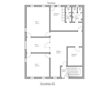 Über einen separaten Eingang ist das Treppenhaus, von dem aus die Büros im Erd- und Obergeschoss erreichbar sind, begehbar. Die Beheizung erfolgt über eine Gaszentralheizung. Im mit überwiegend Teppichboden ausgelegten Erdgeschoss befindet sich der großzügige Empfangsbereich. Es besteht Zugang zu zwei großen Büroräumen, von denen aus das geflieste Besprechungszimmer erreichbar ist. Dieses ist mit einem Smart-Glaselement zum Empfang hin abgetrennt, indirekter Beleuchtung, Bodentank und einem Beameranschluss ausgestattet. Der Serverraum ist klimatisiert. Vom Pausenraum sind die modern gefliesten WCs abgetrennt und es besteht Zugang zur mit Glas überdachten Terrasse mit eingebautem Sonnenschutz. Die Büroräume sind mit Beleuchtungskörpern und vielen Netzwerkanschlüssen ausgestattet.