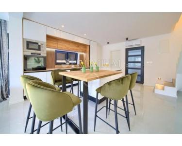 In Malinska steht eine zweistöckige Wohnung mit 99 m² Wohnfläche und 124 m² Garten, mit Pool und Sonnenterrasse, zum Verkauf – ideal für Käufer, die eine Immobilie auf der Insel Krk suchen.