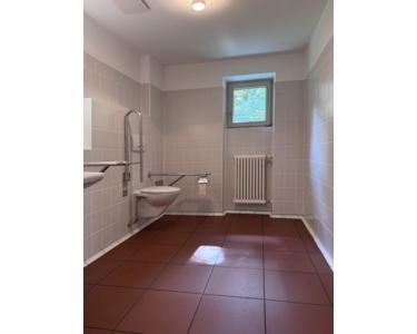 Der Zugang erfolgt über einen Windfang in ein verglastes und lichtdurchflutetes Foyer. Eine große Glastür führt direkt nach außen und verstärkt den offenen und einladenden Charakter. Eine voll ausgestattete Einbauküche mit angrenzender Speisekammer befindet sich im Foyer. Von der Garderobe aus sind die sanitären Anlagen sowie eine Abstellkammer erreichbar. Zusätzlich befindet sich im Erdgeschoss ein Büro mit Archiv sowie Bad mit Dusche, Waschbecken und WC. Das Herzstück des Erdgeschosses ist der beeindruckende Großraum mit imposanter Deckenhöhe. Er ist sowohl von der Garderobe als auch über eine doppelflügelige Außentür erreichbar. Von diesem ist über eine Holztreppe die stilvolle Holzempore begehbar. Sichtbalken und die offene Architektur unterstreichen den loftartigen Charakter dieses Raumes, der sich ideal für Veranstaltungen eignet.