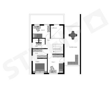 Ein Bad und ein Flurbereich mit Zugang zur Dachterrasse vervollständigen das Raumangebot im Obergeschoss.