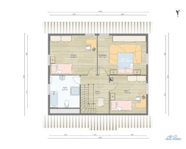 Die Fassade des Hauses ist in einem warmen Apricot-Ton gehalten und verleiht dem Gebäude eine freundliche Ausstrahlung. Das Satteldach mit Betondachsteinen ist nicht nur optisch ansprechend, sondern sorgt gemeinsam mit der hochwertigen Dämmung (120 mm, WLG 040) für eine gute Energieeffizienz. Auf der Südseite schmückt eine großzügige Trapezgaube das Dach und bringt zusätzliches Tageslicht in die Schlafzimmer im Obergeschoss.