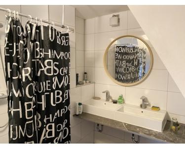 - modern gefliestes Gemeinschaftsbad mit 2 Duschen und Doppelwaschtisch