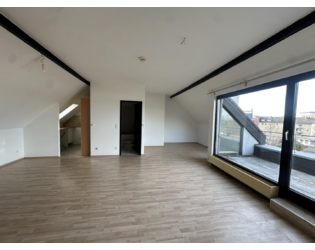 Die Wohnung überzeugt mit einem offenen Grundriss und einem hellen Wohn- und Schlafbereich. Das große Balkonfenster sorgt für viel Tageslicht und ein großzügiges Raumgefühl, mit einem Blick über die Dächer von Rheydt.