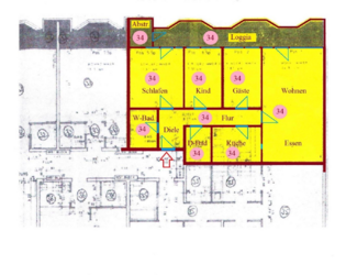 Die Wohnfläche beträgt 82,6 qm und verteilt sich auf ein großes Wohnzimmer mit Essbereich und Durchreiche zur Küche, mittelgroßes Schlafzimmer, Kinderzimmer, Arbeitszimmer, sowie eine Küche mit Durchreiche zum Essbereich, Diele /Flur, ein Bad mit Wanne und WC, ein Bad mit Dusche und WC, sowie eine Loggia mit Abstellraum.