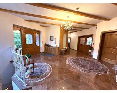 Schon beim Betreten der geräumigen Diele durch die rustikale Holzeingangstür wird klar, dass hier ganz besondere und großzügige Räumlichkeiten (Deckenhöhe 2,75 m) auf Sie warten. Alle Zimmer sind lichtdurchflutet und vermitteln dadurch ein ausgesprochen freundliches Ambiente. Ob Büro/Gästezimmer, Schlafzimmer, Esszimmer oder Gäste WC, es ist deutlich zu merken, dass hier vom Fußboden bis zur Zimmerdecke mit Augenmaß ausgestattet und eingerichtet wurde. Im großzügigen und offen gestalteten Esszimmer und Wohnzimmer, welches übrigens über einen Kamin/Kachelofen und einen Ausgang auf die teilüberdachte Terrasse mit Süd-West-Ausrichtung verfügt, ist Echtholzparkett verlegt, im Schlafzimmer beispielsweise Teppich und die Badezimmer, eines mit Dusche und Badewanne, sowie die Küche mit Einbauküche und der große Abstellraum sind sinnvollerweise gefliest. Eine Etage mit Fußbodenheizung und elektrischen Rollläden, die wenig Wohnwünsche offenlässt. Es ist zu ergänzen, dass auch Esszimmer und Küche einen Ausgang zur Terrasse haben.