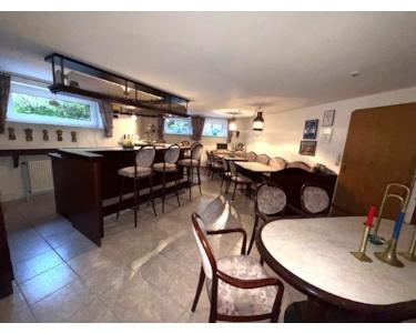 Die innenliegende Treppe in der Diele führt Sie in den gleichermaßen geräumigen Keller, der nach seiner Aufgabe natürlich über einen Heizungskeller mit Ölheizung und Öllager, eine Waschküche mit Waschmaschinenanschluss etc. und diverse Lagerräume verfügt. Darüber hinaus finden ein Büro, ein weiteres WC mit Waschbecken, ein weiteres Badezimmer mit Dusche und sogar eine Kellerbar oder vielmehr ein Partyraum hier ihren Platz. Zusätzlich hat der Keller einen separaten Aus-/Zugang.