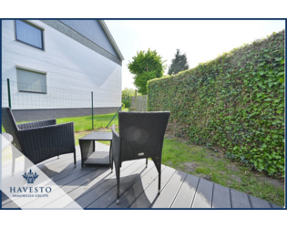 Die angrenzende Terrasse mit eigenem Gartenanteil ist direkt vom Wohnbereich aus zugänglich und bietet eine geschützte Rückzugsmöglichkeit im Freien.