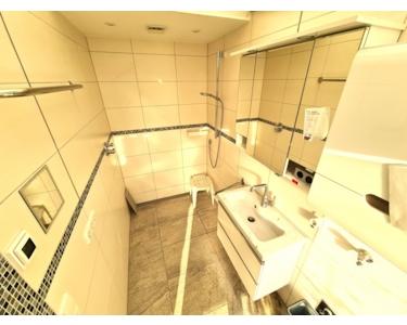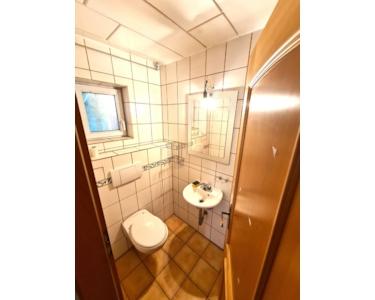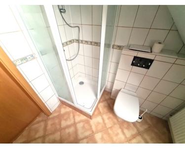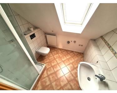 # Tageslicht-Badezimmer mit Dusche, WC, Handwaschbecken und Heizung im OG