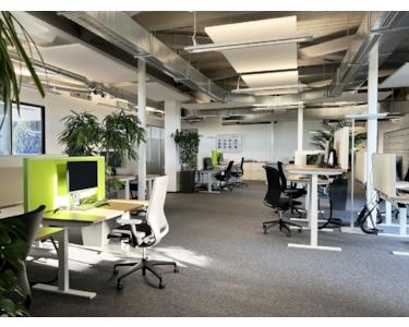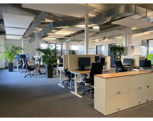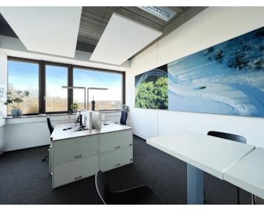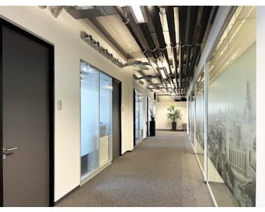 Ausgestattet zum Teil mit hohen Schallschutz-Türelementen mit festem Glasseitenteil, großzügigen Fensterflächen, die mit ihren Jalousien für eine optimale Tagesbelichtung sorgen, teilweise innenliegende Lamellenvorhänge und eine außergewöhnlich hohe Raumhöhe verleihen dieser Bürofläche Qualität. Die offene Deckenlösung verleiht den Räumen Größe, die abgehängten Schallabsorber lassen entspannt arbeiten. Die Trennwände sind in Weiß gehalten und lenken nicht ab.