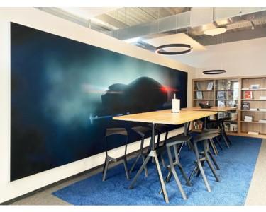 Die dekorativen Wand-Schallschutzelemente mit Fotodruck und die Fotomotive auf Glas können auf Wunsch über den Hersteller problemlos mit neuen Drucken versehen werden. Die Fotos zeigen die Möblierung des Vormieters und sind nicht Bestandteil der Mietfläche.