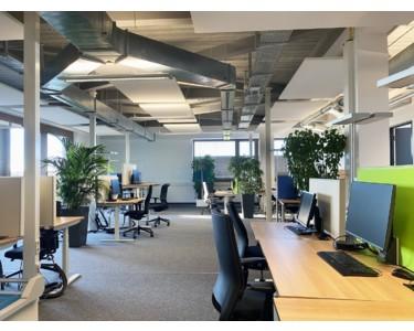Hochwertige Ausstattung mit Schallschutzelementen. Bis zu 60 Arbeitsplätze sind möglich.