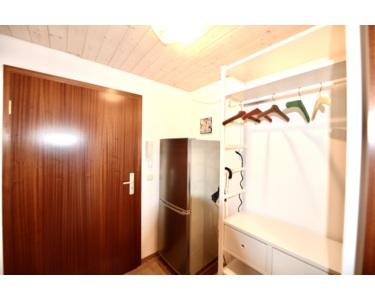 Die Terrassen Wohnung ist im Allgäuer Landhausstil möbliert, es gibt eine Einbauküche mit Backofen und Ceranfeld, eine Spülmaschine sowie eine Kühl- und Gefrierkombination die im Flur neben der garderobe steht, ein Schlafzimmer mit Doppelbett und Schrank, sowie ein Wannenbad mit Glaswand zum Duschen und eingebautem Spiegelschrank.