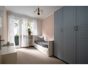 Das Schlafzimmer liegt direkt neben dem Wohnbereich und verfügt ebenfalls über einen eigenen Balkonzugang. So genießen beide Räume eine gleichmäßig helle Atmosphäre.
