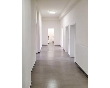 Hinter der Eingangstür öffnet sich ein Ensemble aus sechs hellen Räumen, die dank großer Fenster und großzügiger Glastüren von viel Tageslicht durchflutet werden. Die hohen Decken schaffen ein angenehmes Raumklima und unterstreichen den repräsentativen Charakter der Fläche.