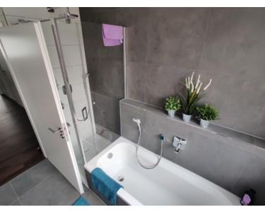 Vinyl und Fußbodenheizung ausgestattet. Das Bad verfügt über eine Badewanne, eine