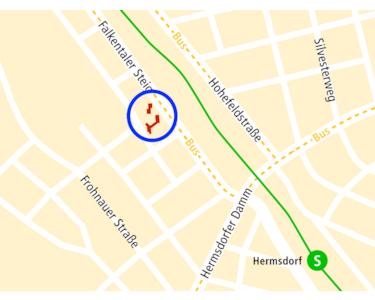Hermsdorf ist ein begehrter Stadtteil im Norden von Berlin. Wer die Harmonie von Mensch und Natur sucht, ist hier genau richtig. Der gesamte Ortsteil ist durchzogen vom Fließtal, einem Naturschutzgebiet, das durch sattes Grün geprägt ist. Die unmittelbare Nähe zum Tegeler Forst macht gerade Hermsdorf zur idyllischen Wohnlage für Menschen mit Sinn für Ruhe und Geborgenheit. Auch mit seiner Infrastruktur steht Hermsdorf mitten im Leben. Hier finden Sie neben allen Einkaufsmöglichkeiten auch Restaurants, Cafés, Banken sowie den Anschluss an die Buslinie 125 und die S-Bahnlinie 1, die eine hervorragende Anbindung an die Berliner Innenstadt bietet. Das renommierte Dominikus-Krankenhaus ist fußläufig in ca. 10 Minuten zu erreichen.