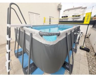 Die Wohnfläche von 60 m² umfasst einen Eingangsbereich, einen Abstellraum, zwei Schlafzimmer sowie eine offene Küche mit Ess- und Wohnbereich. Vom Wohnbereich gelangt man in den gepflegten privaten Garten von 96 m², der ausreichend Platz im Freien bietet. Auf dem Grundstück befindet sich außerdem ein Intex-Pool.