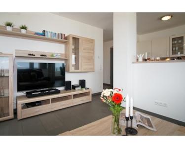 Auf der gegenüberliegenden Seite des Esszimmers finden Sie das Wohnzimmer mit einem gemütlichen Ecksofa, dieses stehen vor einem für den großen Fernseher passenden Unterschrank mit seitlicher Vitrine.