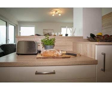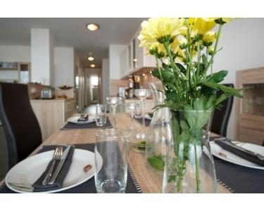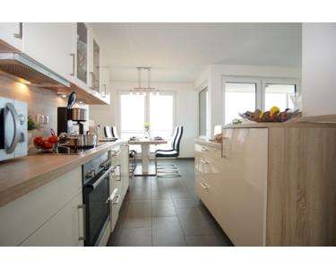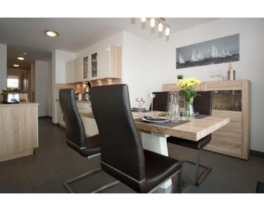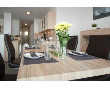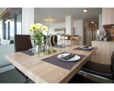 Treten Sie durch die Wohnungstür in Ihr Penthouse ein und gelangen Sie über einen kleinen Flur in die großzügige Wohnküche mit einem ansprechenden Essbereich. Hier steht ein großzügiger Esstisch mit Platz für aktuell vier Esszimmerstühle.