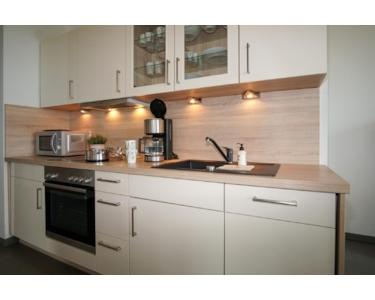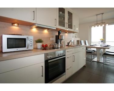 Die Einbauküche erstrahlt im modernen Design mit hellen Fronten, eleganten silbernen Griffen und einer passenden Arbeitsplatte. In den großzügigen Schränken und Schubladen findet alles, was die Küche hergibt, bequem Platz.
