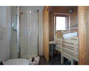 Direkt gegenüber den beiden Schlafzimmern erreichen Sie über einen kleinen Flur das Badezimmer mit warmen Fliesenboden und dezent hellen Wandfliesen. Hier erwartet Sie eine großzügige und liebevoll gestaltete Dusche sowie eine finnische Sauna. Ein geräumiger Waschtisch und eine Toilette runden das Gesamtbild ab.