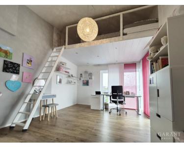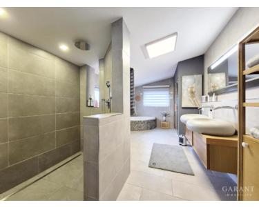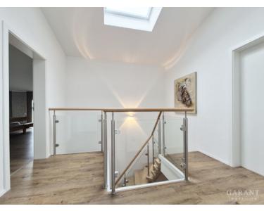 Im Obergeschoss setzt das Masterbad mit Villeroy & Boch Pure Stone, einem Whirlpool und einer finnischen Sauna luxuriöse Maßstäbe in puncto private Wellnessmomente. Klimaanlagen in allen 3 großzügigen Schlafzimmern schaffen jederzeit ein angenehmes Raumklima. Ein weiteres Badezimmer steht zur Verfügung und schafft so entspannte Abläufe im Familienalltag. Vom Balkon genießen Sie die Aussicht in den luxuriös angelegten Garten oder lassen den Blick über die angrenzenden Felder schweifen.