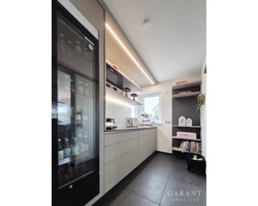 Das Herzstück des Hauses, ist der lichtdurchflutete Wohn- und Essbereich, der mit 2,75 m Deckenhöhe, bodentiefen Fenstern und einem eleganten Design-Ofen ein luxuriöses Wohlfühlambiente schafft. Die maßgefertigte Schreinerküche mit hochwertigen Gaggenau-Geräten, edler Granit-Arbeitsplatte und großzügiger Kochinsel erfüllt höchste Ansprüche, abgerundet durch ein Quooker-System für kochendes, stilles oder sprudelndes Wasser auf Knopfdruck. Eine elegant integrierte Tageslicht-Speisekammer am Eingang sorgt für kurze Wege, Ordnung und maximalen Komfort im Küchenalltag. Ein vielseitig nutzbares Zimmer, ideal als Gästezimmer oder Homeoffice, sowie ein stilvolles Gäste-WC vervollständigen das durchdachte Raumangebot des Erdgeschosses.