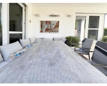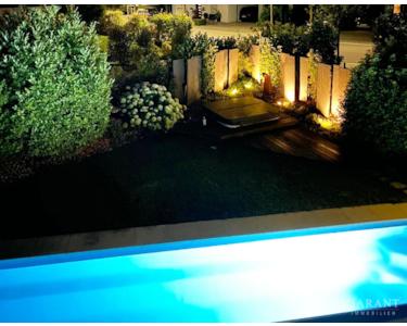 Der Außenbereich verspricht Urlaub pur, jeden Tag! Ein beheizter 10 × 4 m Salzwasserpool mit elektrischer Abdeckung, eine weitläufige Bangkirai-Terrasse, ein Whirlpool für fünf Personen und ein rund 500 Jahre alter Olivenbaum schaffen mit einer stimmungsvollen Außenbeleuchtung ein mediterranes Flair, das zum Entspannen und Genießen einlädt.