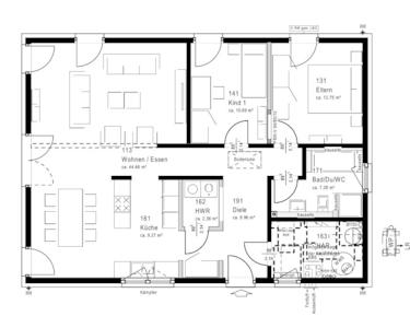 Der kompakte Bungalow-Stil bietet auf rund 103 m² Wohnfläche alles, was Familien oder Paare zum Wohlfühlen benötigen. Der großzügige Wohn- und Essbereich mit direktem Zugang in den Garten, ein Elternschlafzimmer, ein Kinderzimmer sowie Küche, Bad und zwei praktische Nebenräume schaffen ein kompaktes, funktionales Raumkonzept auf einer Ebene. Dank der Holzständerbauweise durch einen renommierten Fertighaushersteller profitieren Sie von Qualität „Made in Germany“ und hoher Flexibilität bei der Gestaltung.